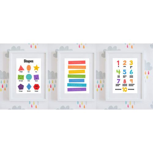 Set of 3 Shapes, Days of The Week & Count to Ten Wall Art in Rainbow Colours